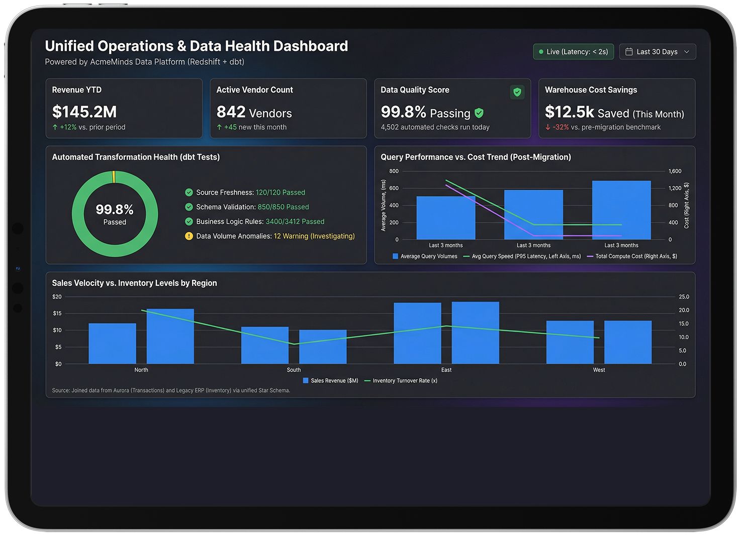 Following implementation, teams gained faster access to reliable, consistent data. Manual effort in analytics and reporting was significantly reduced. New vendors could be onboarded more quickly. Data warehouse costs were lowered. Confidence in data driven decision making improved across the organization.
